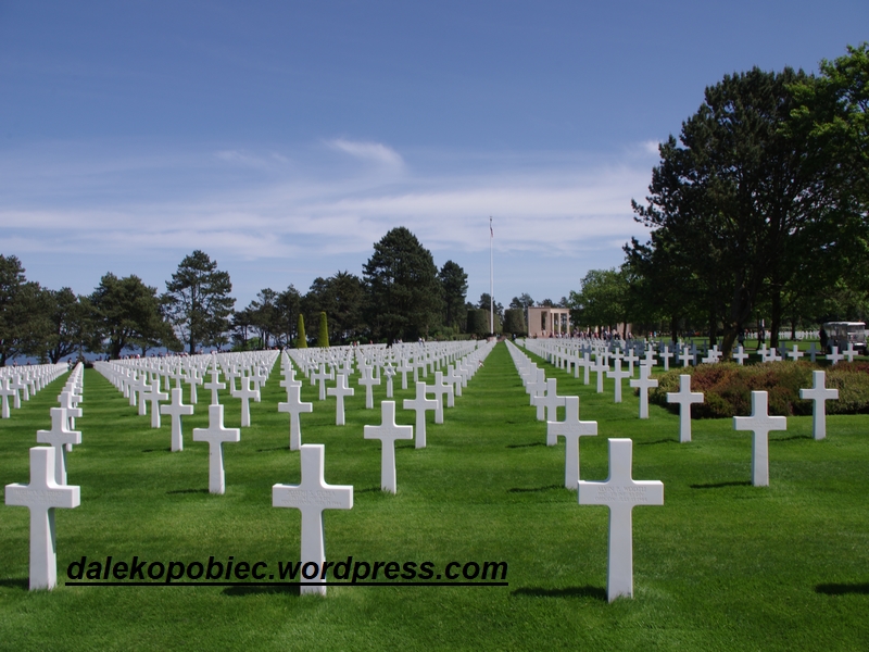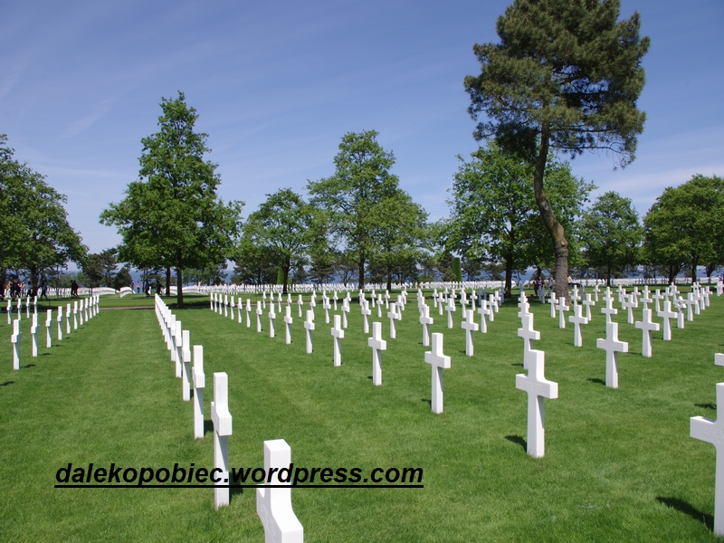 nijak się ma do dramatycznego lądowania aliantów. Ale za to „amerykański” cmentarz to lekcja pokory . Collevile-sur-Mer czyli prawie 9400 krzyży amerykańskich żołnierzy poległych w bitwie o Normandię.