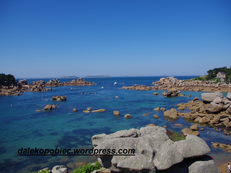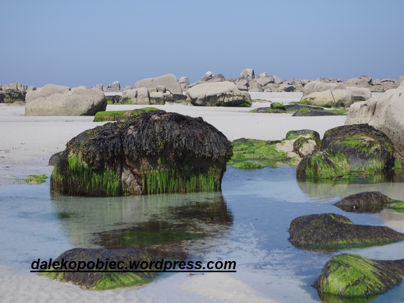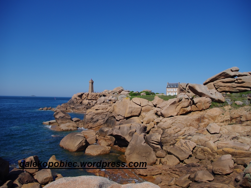 Die Côte de Granit Rose to miejsce które ma ponad 300 milionów lat . Ha Ha może nie od razu powstało w takiej formie ale skały właśnie pochodzą z tamtych okresów ( Karbon ) i nadały dość rzadki kolor całemu wybrzeżu . Tam właśnie jedyny raz spotkaliśmy się zapełnionymi campingami . Może to splot dwóch rzeczy a więc weekendu majowego i pięknej pogody, ale powiem że miejsce super na piękną pogodę. Znajdujemy jeszcze wolne miejsca (koło godziny15 a już 16 powieszono tablicę o braku miejsc) na campingu w Tragastel w samym sercu Cote deGranit Rose i ruszmy drużką prosto prowadząca do wybrzeża różowego granitu który podobno występuje jedynie w trzech miejscach na ziemi.