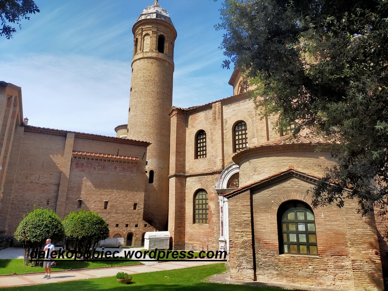 Camping był na wysokim poziomie z basenem ale niestety godziny otwarcia atrakcji został bardzo skrócony więc nie było za bardzo czasu na korzystanie Następnego dnia wyruszyliśmy w kierunku Rimini. Drogi krajowe nie są płatne a po za tym była to najkrótsza trasa więc trochę z przymusu bo co autostrada to autostrada. Trasa nie była zła mimo licznych ograniczeń nikt jakoś się do nich nie stosował z licznymi ciężarówkami na czele. Czasami np. przy ograniczeniu do 60km/h ciężarówa cisła 80 więc żeby wyprzedzić trzeba było mieć co najmniej koło 100 a to mnie już nie bawiło. Z resztą poznaliśmy na jednym parkingu polskiego kierowcę przewoźnika i opowiedział nam o bardzo nie równym traktowaniu obcokrajowców ( z licznymi przykładami) , twierdził nawet że policja ma układy z biznesami (dziwne kaucje , parkingi strzeżone, pomoc drogowa) wyłudzającymi pieniądze trudne do odzyskania. Od tego momentu pedał gazu jakby stał się bardziej oporny. Nas przez cały pobyt i tyle tysięcy kilometrów nic złego nie spotkało więc może należy tylko (hi hi) jeździć przepisowo? Jak wspomniałem droga SS19 to taki mix dwupasmówek , rond , ograniczeń ale jak najbardziej nie była to zła trasa. Po drodze Zatrzymaliśmy się w Ravenna . Małe miasteczko z przepięknymi kościołami z jeszcze piękniejszymi mozaikami . Opinie tę wyrobiłem sobie na podstawie zdjęć z internetu ponieważ z powodu ograniczeń zwiedzanie było dość ograniczone (terminy , godziny wejścia czas pobytu ,tylko ustalone on-line na wszystkie 4 kościoły przy jednej rezerwacji rozrzucone w różnych miejscach)