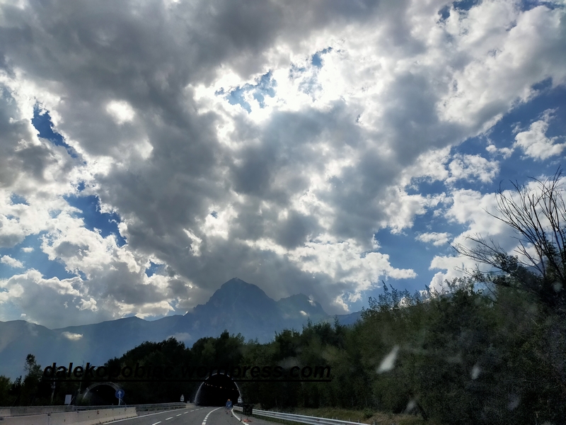 Droga między dwoma stronami to taka trochę autostrada, trochę expresówka ,o dziwo bezpłatna. Ale co jeszcze nas bardziej zdziwiło to że jechaliśmy praktycznie cały czas przez większe lub mniejsze pasma gór. Gdzie są te pola pomidorów, gdzie są te winnice lub gaje oliwne ? Dopiero pisząc ten blog zorientowałem się ż przejechaliśmy przez wielkie parki narodowe . I np Park Narodowy Gran Sasso to nawet szczyty ok 2900m. npm. A także ż jest tam najdalej wysunięty na płd. lodowiec. No właśnie środek Włoch i lodowiec. Może dlatego przejeżdżając tamtędy miałem wrażenie niegościnności czy może bardziej surowości tamtego regionu.