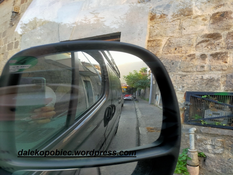 Najpierw zdradzę że gospodarstwo znajdowało się pomiędzy Neapolem i Salerno czyli w podobnej odległości od Wezuwiusza , Pompeji i wybrzeża Amalfi . Plan dobry a co z realiami ? Wyruszyliśmy rano . Do przebycia tylko ok 500 km. Powoli zjechaliśmy z gór na autostradę A1 łączącą północ z południem . I od razu szok że Neapol i przynależące miasteczka to tak wielki obszar z przepełnionymi ,zakorkowanymi drogami. O ile na autostradzie nie było tragicznie , bo korki znamy i z Niemiec i naszej A4 to w momencie zjazdu do miasta przez które tylko zahaczyliśmy w drodze ma nocleg. W najgorszym momencie ok 18 godz. znaleźliśmy się w szczycie ruchu ludzi wracających do domów kolejne 10km to ok godziny jazdy . I do tego drogi coraz węższe z coraz bardziej zablokowane chaotycznie zaparkowanymi autami. Powoli docierało do nas że wybraliśmy nocleg do na końcu jakiejś dróżki prowadzącej na szczyt lokalnej górki gdzie nasz opel nie wjedzie . Ostatni kilometr zaskoczył nas znakiem ” wjazd aut o dopuszczalnej szerokości 1.9m ”. Nasze autko z rozłożonymi lusterkami to 2,25. Postanowiłem się wycofać . Ale nie dane nam było tak łatwo bo za nami sznurek aut z poirytowanymi kierowcami. Żadnej możliwości zawrócenia . Jedziemy dalej pomiędzy domami i docieramy do bramy . Znak mówi że 1.9m i widzę że dróżka była szersza ale brama już nie . Wychodzimy i próbójemy na migi pokazać ślimaczącymi się za nami kierowcom że to już finito i wszyscy musimy cofać… Nie zanudzając was dalszą historią gdzie przez nerwy i stres bardzo uszczupliliśmy nasz poziom zadowolenia Jeden z kierowców dał mi do zrozumienia że widziano już tu takie auto i przy pomocy innych(składanie lusterek i liczne oczy w koło auta) przejechaliśmy przez tą cholerną bramę. Ironią było też to że z przeciwnej strony już stały auta które jechały w przeciwnym kierunku a jedyna mijanka to wielki centralny plac przed bramą właśnie z drugiej strony. . Ode chciało nam się jazdy na kolejne dwa dni .
