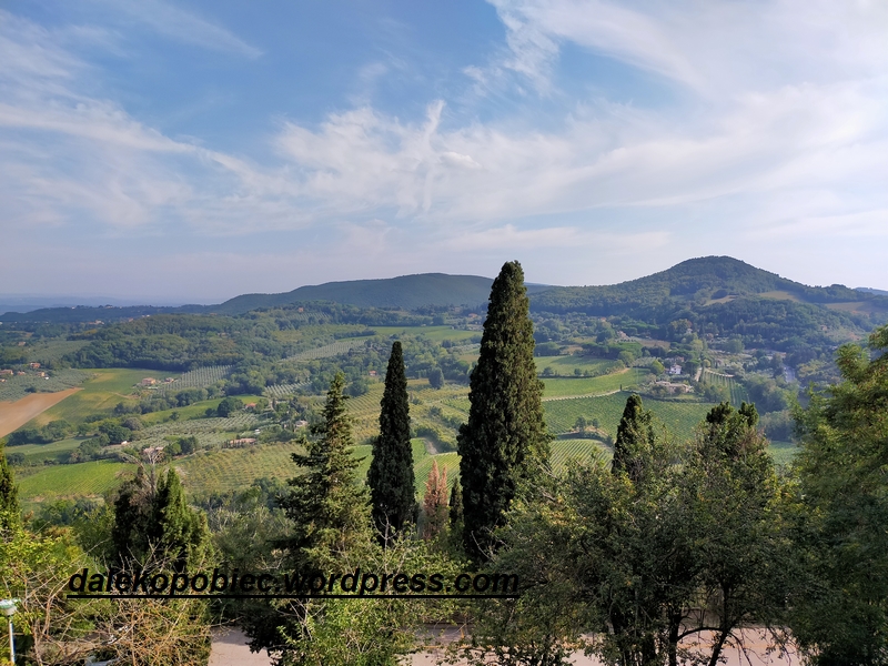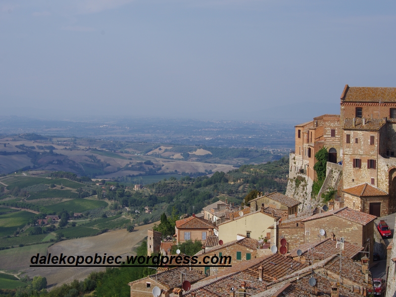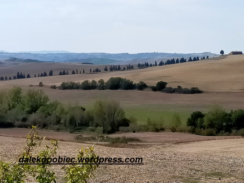 Zmęczeni wielogodzinnym spacerem przy pełny słońcu ruszamy zobaczyć słynną Toskanię. Obieramy za cel polecany rezerwat gdzieś pomiędzy Montepulciano a Pienza o wdzięcznej nazwie Val d’Orcia. I znajdujemy się gdzieś pomiędzy niczym . Ale to ” nic ” pofałdowane niewielkimi wzgórzami, pochylonymi polami , z płotami z tui, czy cyprysów , małych miasteczek wyglądających jak by czas zatrzymał się tam i nie zamierzał w ogóle ruszyć ma jednak urok . Wiosną to wszystko tu ożywa ale koniec lata to ciężki okres dla tych ziem. Mimo suchej , spalonej słońcem ziemi trochę oczyma wyobraźni , trochę wspomnieniami licznych obrazów z wielu filmów (Pod słońcem Toskani , Ukryte pragnienia ,Pod słońcem, Sen nocy letniej czy wreszcie Gladiator ( parę scen ale jak bardzo znanych)) widzę kobierce w licznych odcieniach zieleni , dojrzewające zboża poprzecinanymi wstążkami dróg.