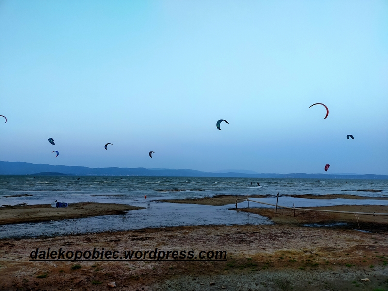 Na nocleg wybieramy najbliższy zbiornik wodny. No cóż woda to ochłoda dla ciała a szczególnie nóg. Niecałe 30 km. Jedziemy .Wita nas piękne jezioro z masą kitesurfingowców. Nie wiem czy to słowo jest poprawne ale wiecie o co mi chodzi. Co nas nie cieszy to że jest dość chłodno , dość późno ,bardzo wietrznie i w powietrzu masa można powiedzieć plaga nie tak małych zielonych owadów a do tego jeszcze znaczna ilość wrednych komarów.