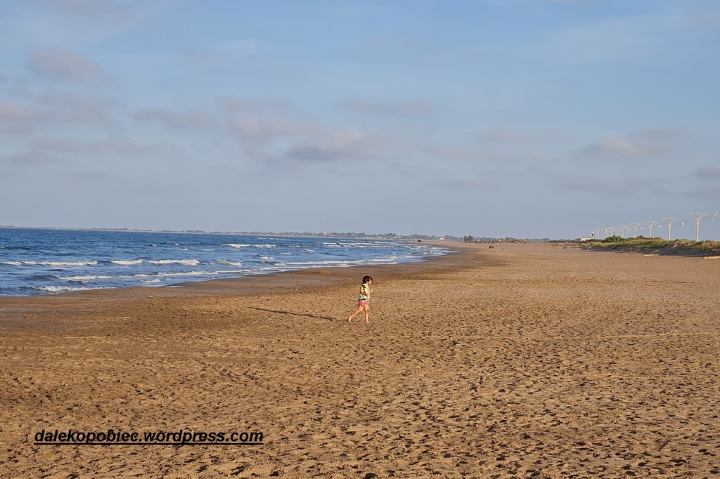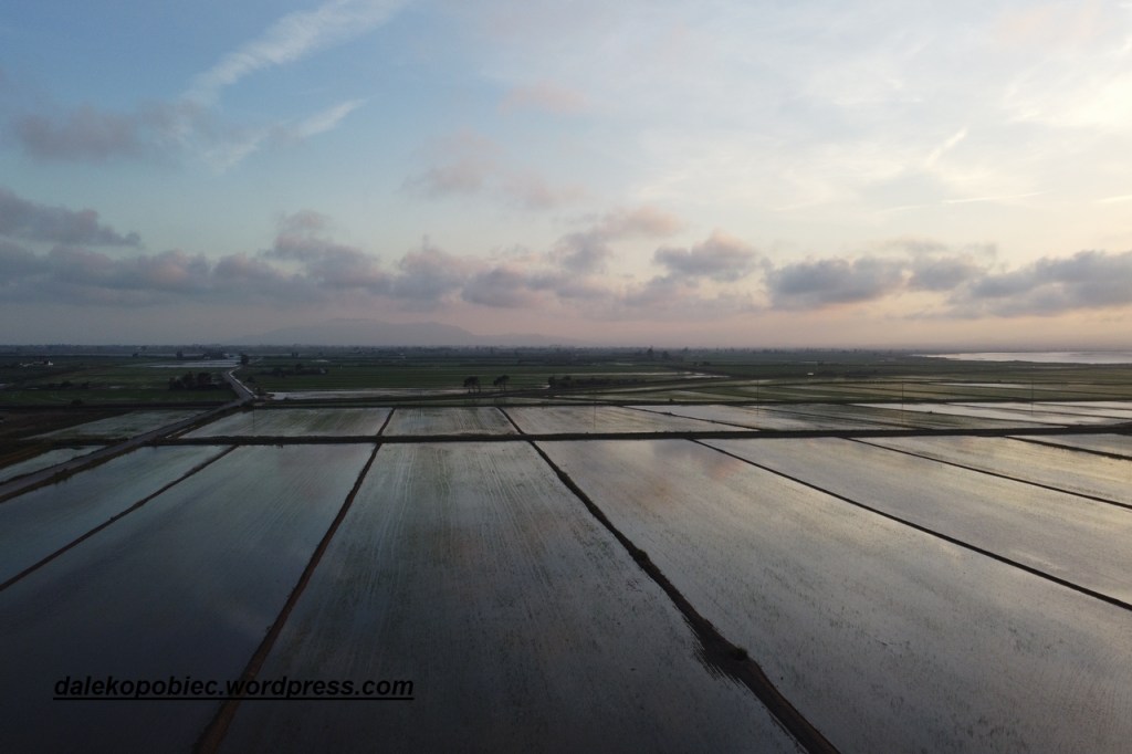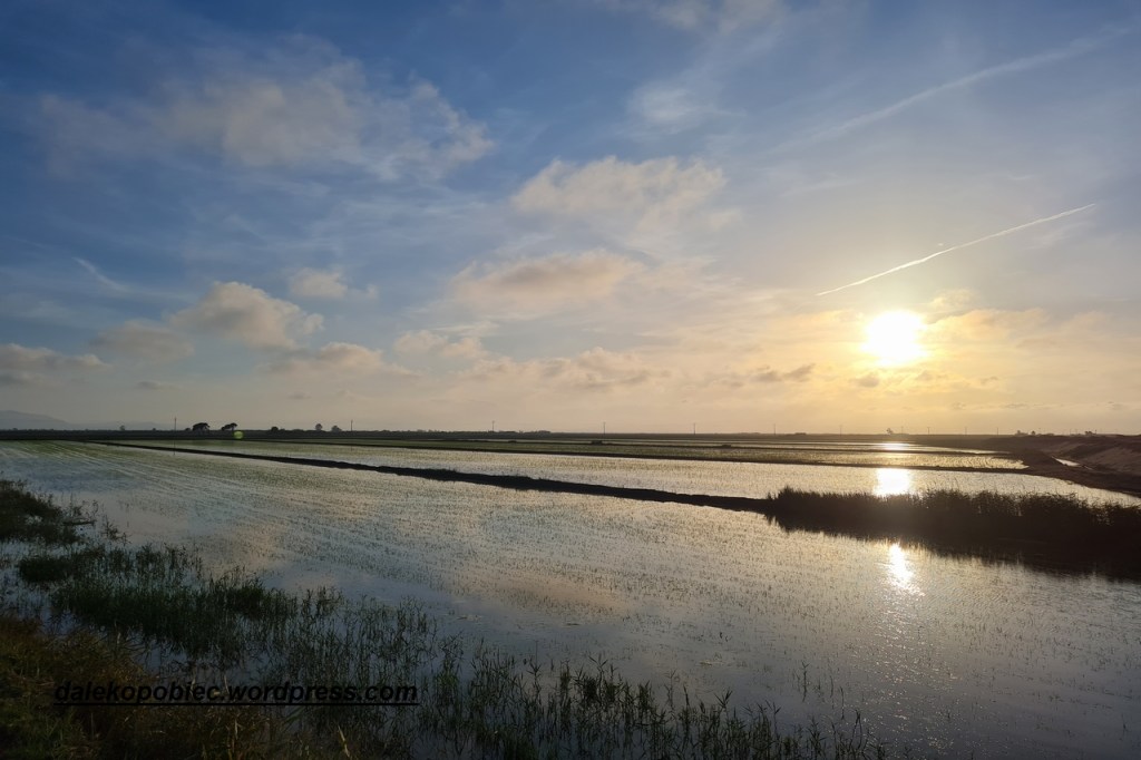 Docieramy do ujścia rzeki Ebre . Już parędziesiąt kilometrów wcześniej rzeźba terenu się wypłaszcza . W ogóle to jakby inna Hiszpania . Przejeżdżamy przez liczne wodne pola . Niektóre suche , częściowo zalane czy wręcz pod wodą. Przypominają pola ryżowe i doczytujemy później że są to właśnie pola ryżowe . Turystów jak na ten czas było dość sporo tym bardziej żeby się dostać w te rejony trzeba niestety odbić od utartych kierunków . Jako ciekawostkę dodam że 90000 ton ryżu podobno bardzo dobrej jakości ( można spróbować w knajpkach ) uzyskuje się z plonów co roku . A sieć kanałów nawadniających pola ma około 450 km. długości.
