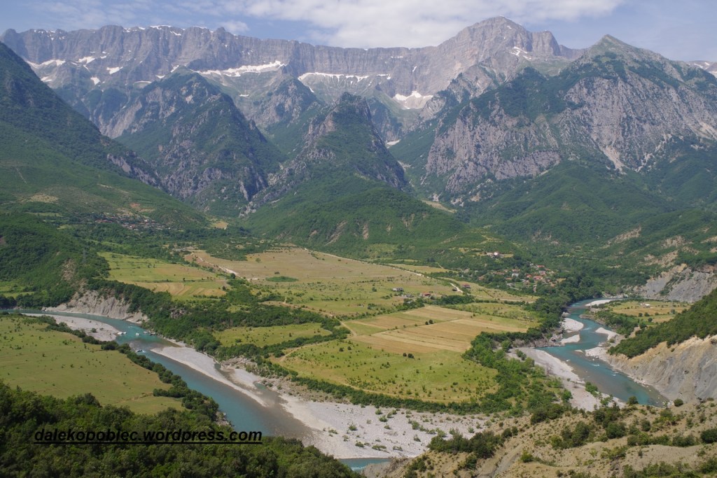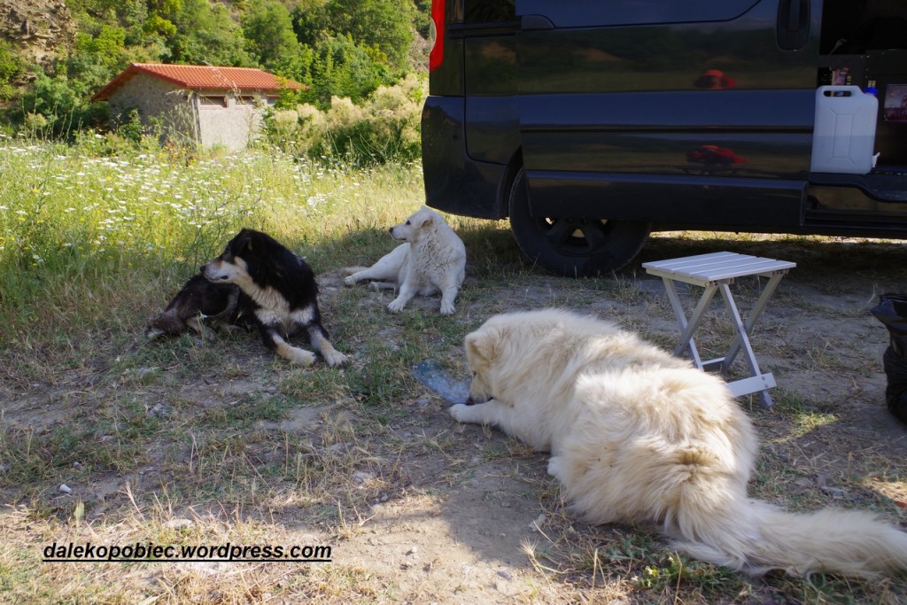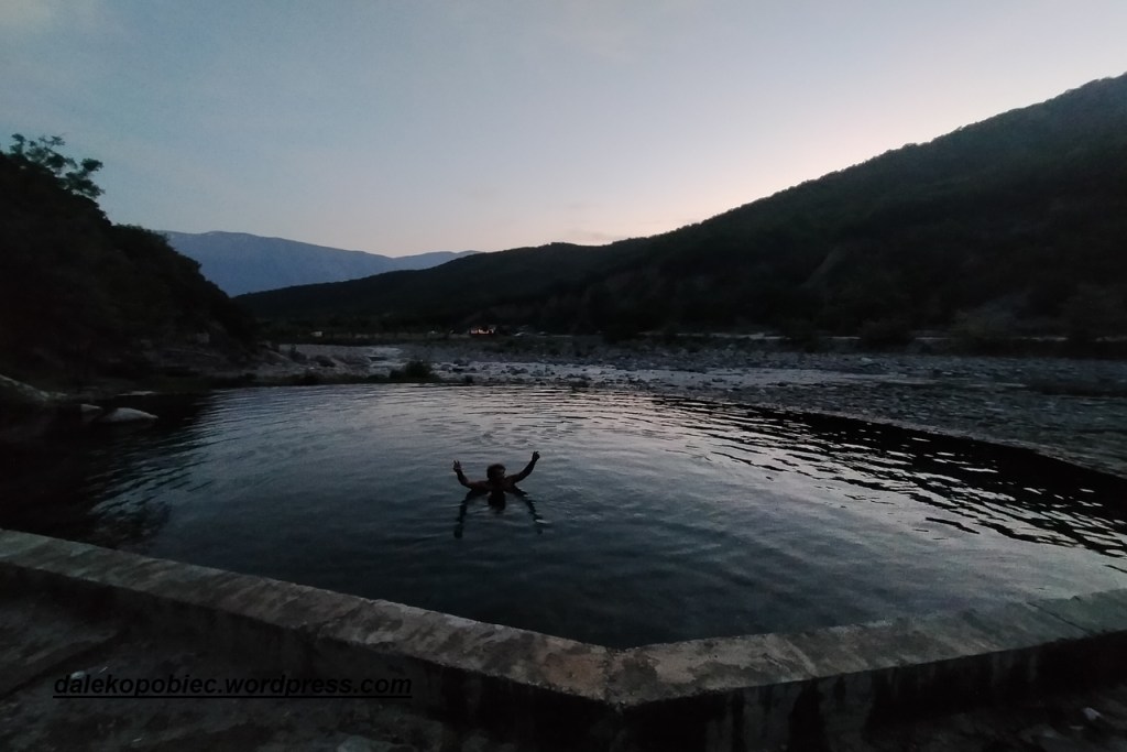 Jadąc dalej można odwiedzić źródła Benji które znajdują się niecałe 14 kilometrów od Përmet. Dojechać tam można kierując się drogą SH75 , myśmy troszkę po błądzili ale jakoś tam dotarliśmy . Duży teren jest przeznaczony chyba pod kampery i namioty ponieważ jest dość płaski i z jakby wydzielonymi skrawkami ziemi ot taki dziki lub sezonowy camping . Jest nawet knajpka oraz jakieś małe budynki sugerujące toalety ale były zamknięte wiec trudno powiedzieć . Same źródła to dwa baseny .Mniejszy nazwijmy kameralny bo już parę osób sprawia wrażenie że jakby było już za dużo ludzi i duży nazwijmy ogólnodostępny. Mieliśmy pecha i nawet duży pod naporem lokalnej wycieczki paru autokarów z uczniami okazał się raczej nie do odwiedzin . Miało być cicho i spokojnie. Ale i dzieciarnia musiała się w końcu wyszumieć i pod koniec dnia mogliśmy się spokojnie udać na kąpiel . Po ponad 30 stopniowym upale woda okazała sie wcale nie za ciepła . Temperatura oscyluje ok 25 do ponad 30 ale myślę że w ten dzień chyba oscylowało w niższych partiach. |Ale nie to okazało się najgorszą rzeczą a miliony małych muszek latających tuż nad wodą . Nie wiem czy zapach siarki je tak wabił czy zmierzch ale przy każdym oddechu miałem wrażenie że minimum parę z nich kończyło żywot w moim gardle .Samo miejsce warte jest spędzenia tam paru dni. Miłego towarzystwa na pewno nie braknie bo po okolicy pląta się liczna grupa żebrzących ale miłych piesków .