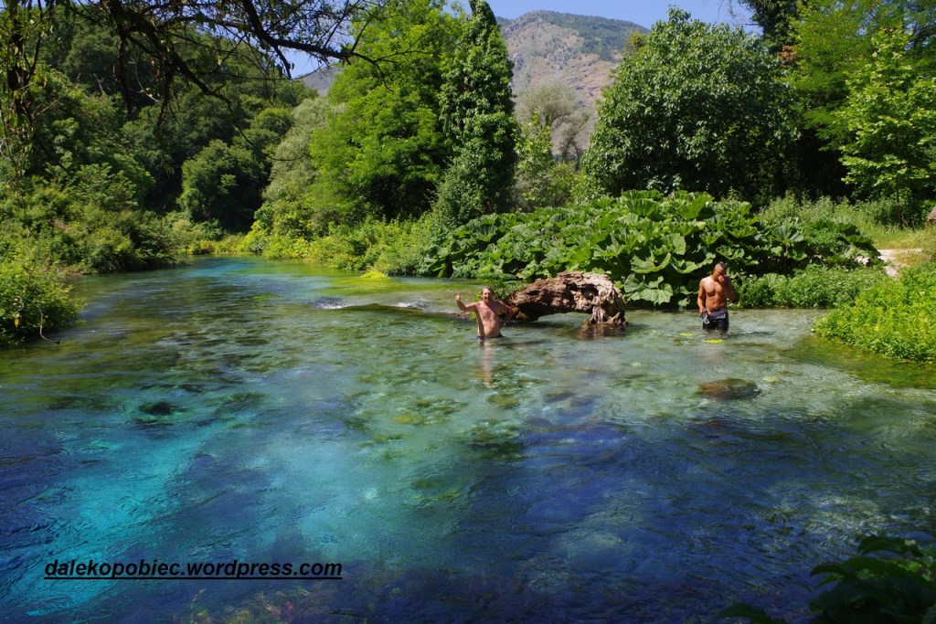 Oczywiście niech was nie zmylą sielankowe fotki bo trochę kiczu i albańskiego porządku też jest tam sporo . Ale najważniejsze że można tam spędzić naprawdę miło czas . My obieramy już kierunek powrotny ale jeszcze z paroma ciekawymi miejscami . Najpierw źródło Syri i Kaltër bardziej znane jako Blue Eye . Jest to turkusowo niebieskie oczko wodne z którego wydobywa się bagatela ok 6000 litrów wody na sekundę o dość stałej temp .12,5 stopnia . Główną atrakcją oprócz pięknych kolorów to skok z niewysokiej platformy do szczeliny w sumie nie wiadomo jak głębokiej , bo ze wzgląd na silny wyrzut wody nikt jeszcze jej nie zbadał . Pikanterii dodaje …zakaz kąpieli ale raczej nikt się tym nie przejmuje. Atrakcja jest darmowa , parking też więc w sumie należy się tam wybrać .